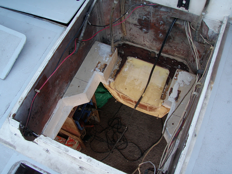 The last pictures I got of the nacelle construction job were take on 30 March, just before we started making the boat cover. The yellowish area is part of the nacelle which is now attached to the underside of the bridgedeck. The outboard engine will hang from an aluminum framework (not shown) Dick made and had welded by a local metal shop. The outboard will be raised up when we're underway by sail.
